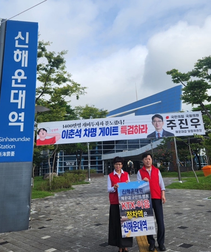 [뉴스노크=김인호 기자] 국민의힘 소속 부산 해운대구의회 서창우·유점자 의원이 8월 13일부터 신해운대역 KTX-이음 정차 촉구 릴레이 피켓 캠페인을 시작한다. 두 의원은 순차적으로 역 앞에서 피켓을 들고 주민들과 함께 정차 필요성을 알렸다.