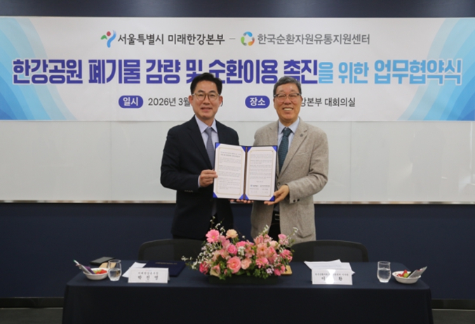 [뉴스노크=김인호 기자] 서울시 미래한강본부가 12일 한강공원 내 폐기물 감량 및 순환이용 촉진을 위해 폐기물 재활용 분야 전문기관인 한국순환자원유통지원센터(KOrea Resource circulation service Agency, KORA)와 업무협약을 체결했다.