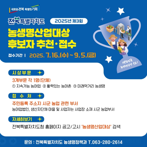 도는 ‘2025년 제3회 전북농생명산업대상’수상 후보자를 7월 16일부터 9월 5일까지 각 시군 농업부서를 통해 접수한다고 밝혔다.