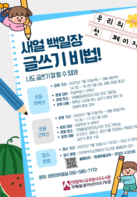 [뉴스노크=김인호 기자] 인천광역시교육청서구도서관은 7월 31일부터 초등학생의 문해력과 창의적 표현 능력 향상을 위한 ‘새얼백일장 글쓰기 비법’ 프로그램을 운영한다.