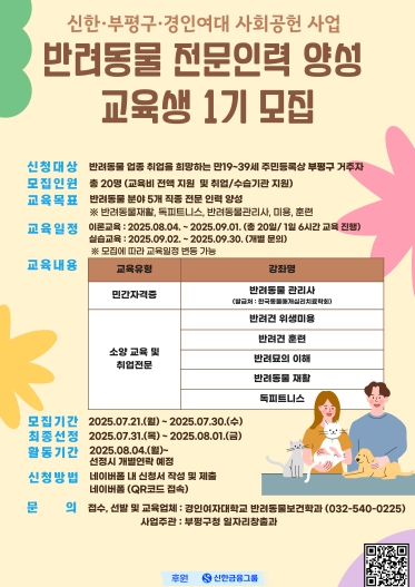 이 교육과정은 구가 신한은행 부평구청지점(지점장 하상남) 및 경인여자대학교 반려동물보건학과와 협력하는 사회공헌사업으로, 취업과 연계된다.