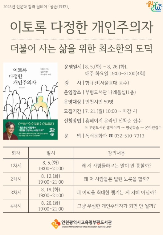 올해 강좌의 주제는 ‘공존’으로, 부평도서관은 서울교육대학교 윤리교육과 함규진 교수의 ‘이토록 다정한 개인주의자’를 바탕으로 더불어 살아가기 위한 윤리적 태도와 철학적 성찰을 나누는 저자 강연을 마련했다.
