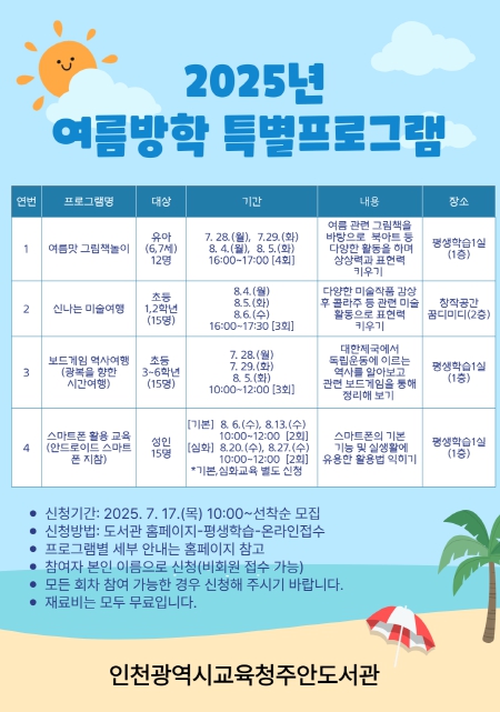 [뉴스노크=김인호 기자] 인천광역시교육청주안도서관은 여름방학을 맞아 7월 28일부터 8월 27일까지 어린이와 지역주민을 위해 준비한 여름방학 특별프로그램의 학습자를 모집한다.