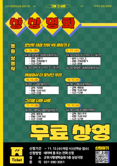 9월 상영은 16일과 17일 이틀간 상상극장에서 진행되며 접수 등 기타 자세한 사항은 군포문화재단 홈페이지 또는 군포시평생학습원으로 문의하면 된다.