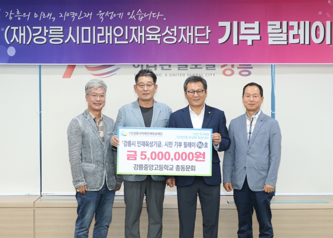 [뉴스노크=김인호 기자] 강릉중앙고등학교 총동문회(회장 이흥남)는 14일 (재)강릉시미래인재육성재단(이사장 김상영)에 장학금 500만 원을 기탁하여, 지역인재 육성을 위한 기부 릴레이에 동참한다.