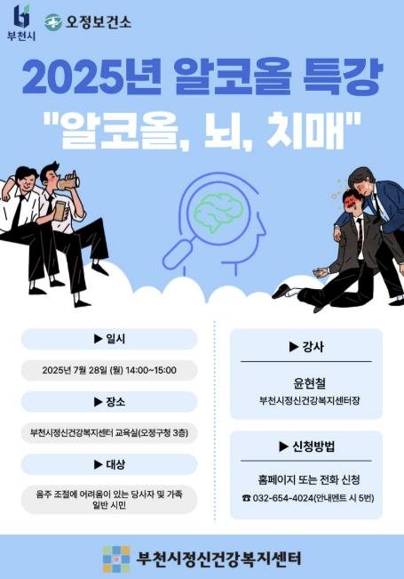 특강은 7월 28일 오후 2시부터 3시까지 오정구청 3층 부천시정신건강복지센터 교육실에서 열리며, 음주 조절에 어려움을 겪고 있는 시민이나 건전한 음주문화에 관심 있는 누구나 참여할 수 있다. 참여 신청은 부천시정신건강복지센터 홈페이지나 전화를 통해 7월 25일까지 선착순으로 받는다.