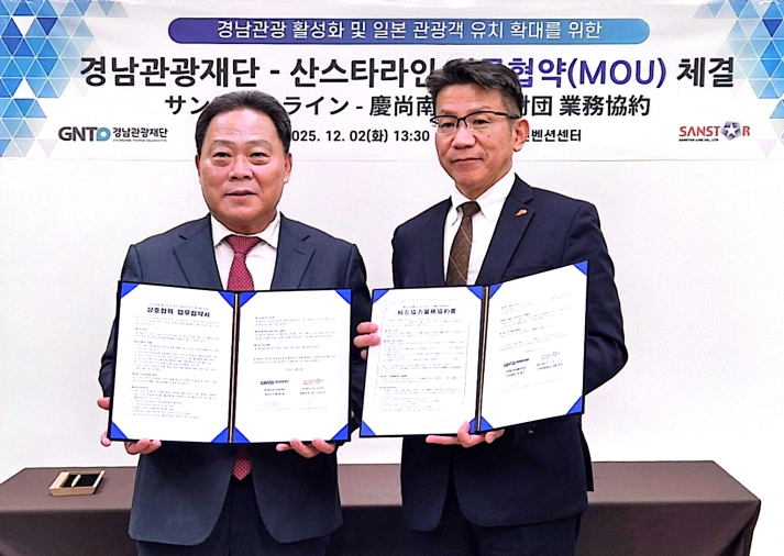 [뉴스노크=김인호 기자] 경남관광재단은 12월 2일 창원컨벤션센터에서 팬스타그룹 일본 현지법인인 ‘산스타라인(SANSTAR LINE)’과 ‘경남 관광 활성화 및 일본 관광객 유치 확대’를 위한 업무협약(MOU)을 체결했다고 밝혔다.