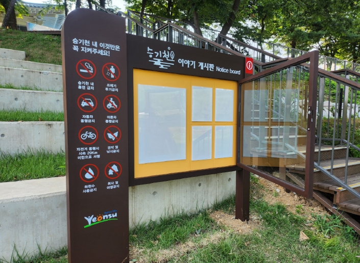 구는 하천을 찾는 구민들이 승기천의 생태적 가치를 보다 쉽고 친근하게 접할 수 있도록 ▲연수체육공원 앞 무대 광장, ▲원인재역 삼성스토어 앞, ▲선학체육관 앞 등 산책로 통행이 많은 3개 지점에 이야기 게시판을 설치했다.