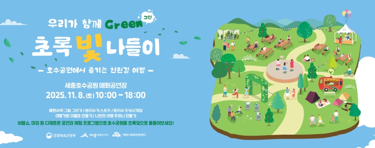 [뉴스노크=김인호 기자] 세종시문화관광재단은 11월 8일 10시부터 18시까지 세종호수공원 매화공연장에서 2025 비단가람 탄소중립 체험행사 ‘우리가 함께 그린(Green) 초록빛 나들이’를 개최한다.