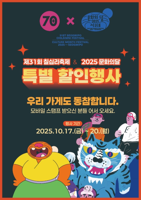 [뉴스노크=김인호 기자] 서귀포시는 ‘제31회 서귀포칠십리축제 & 2025 문화의달 행사’를 맞아 지역 상권 활성화를 위한 다양한 연계 이벤트를 운영한다고 밝혔다.