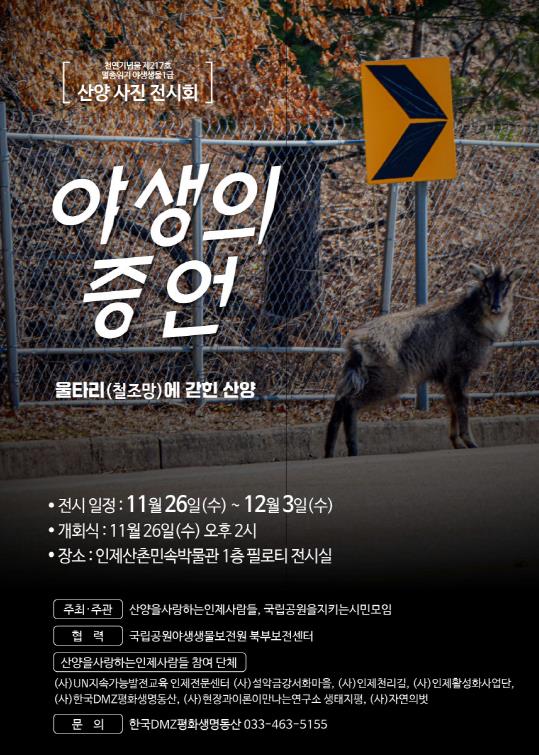 [뉴스노크=김인호 기자] ‘산양을 사랑하는 인제 사람들’과 ‘국립공원을지키는시민의모임’은 오는 11월 26일부터 12월 3일까지 인제산촌민속박물관 1층 필로티 전시실에서 ‘야생의 증언 – 울타리(철조망)에 갇힌 산양(천연기념물 제217호, 멸종위기 야생생물 1급)’ 사진전을 개최한다.