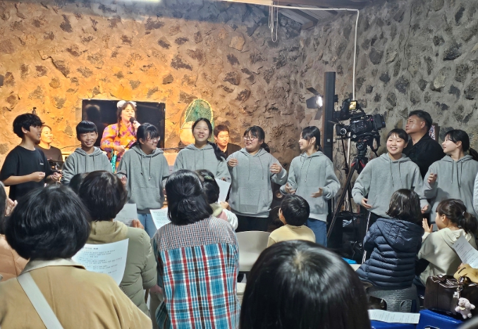 [뉴스노크=김인호 기자] 제주도교육청 수산초등학교는 23일 6학년 학생들이 마을 소통공간 ‘공간믈미’에서 학교와 마을이 함께 준비한 낭독극 ‘우린 영 살아쩌’를 공연했다고 밝혔다.