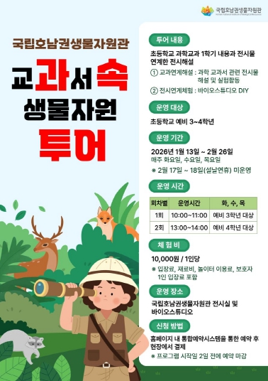 [뉴스노크=김인호 기자] 기후에너지환경부 산하 국립호남권생물자원관은 겨울방학을 맞이하여 예비 초등학교 3학년부터 4학년을 대상으로 교과서에 나오는 생물을 전시관에서 직접 만나보는 프로그램인 ‘교과서 속 생물자원 투어’를 1월 13일부터 2월 26일까지 운영한다고 밝혔다.