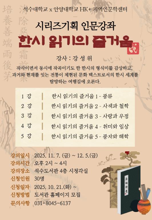 석수도서관 관계자는 “석수도서관과 안양대학교 지역인문학센터가 협업하여 진행하는 이번 시리즈기획 인문강좌를 통해 시민들이 한시의 매력적인 세계를 깊이 탐구하고, 한시를 읽는 즐거움을 알 수 있길 바란다”고 밝혔다.