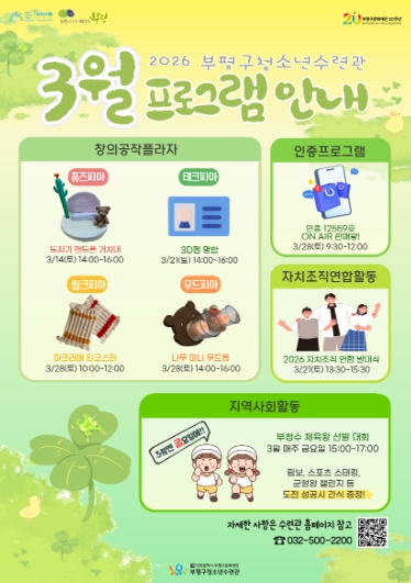 [뉴스노크=김인호 기자] 부평구 청소년수련관은 오는 3월 창의융합 및 진로를 탐색할 수 있는 다양한 프로그램을 운영한다고 밝혔다.