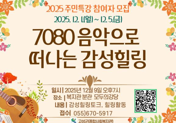 [뉴스노크=김인호 기자] 고성군에서 운영 중인 고성군종합사회복지관에서는 2025년 12월 9일 19시 종합사회복지관 분관 모두의 강당에서 고성군민을 대상으로 7080 음악으로 떠나는 감성 힐링이라는 주제로 특강을 진행한다.
