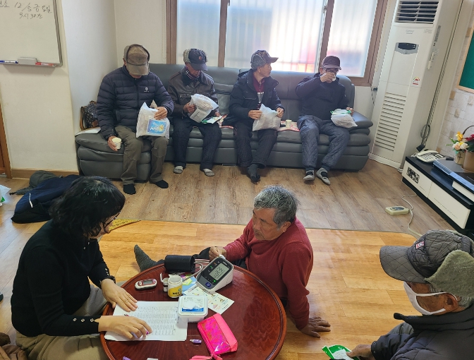 | ▲ 충남 계룡시가 향한1리 경로당을 찾아가 건강취약계층 대상으로 한파 및 낙상 예방 건강교육을 실시하고 있다. |