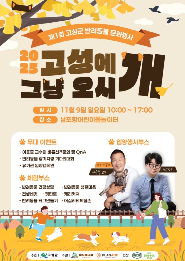 [뉴스노크=김인호 기자] 고성군은 오는 11월 9일 일요일 오전 10시, 남포항 일원(어린이 물놀이터 입구)에서 제1회 반려동물 문화행사 ‘고성에 그냥 오시개’를 개최한다고 밝혔다.