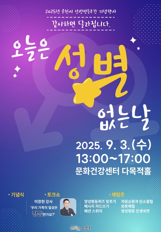 [뉴스노크=김인호 기자] 순천시는 양성평등주간을 맞아 오는 9월 3일 오후 1시부터 5시까지 순천시문화건강센터에서 2025년 양성평등주간 기념행사를 개최한다고 밝혔다.