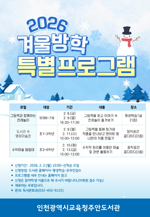 [뉴스노크=김인호 기자] 인천광역시교육청주안도서관은 관내 유·초등학생에게 다양한 평생학습 기회를 제공하기 위해 2월 6일부터 13일까지 ‘겨울방학 특별프로그램’을 운영한다.