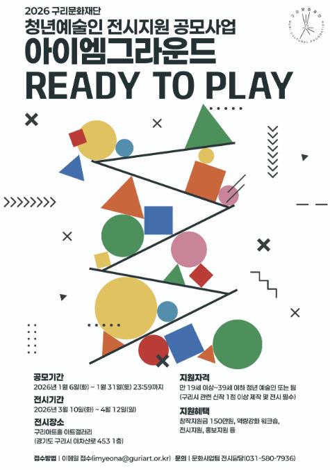 [뉴스노크=김인호 기자] (재)구리문화재단은 청년 예술인의 도약과 성장을 지원하기 위한 청년 정책 플랫폼 사업의 일환으로, 2026년 청년 예술인 전시지원 공모사업 '아이엠 그라운드, Ready to Play'에 참여할 예술인을 1월 6일부터 1월 31일까지 모집한다.