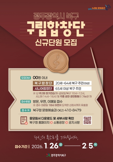 [뉴스노크=김인호 기자] 광주광역시 북구가 아름다운 목소리로 주민들과 소통하는 구립합창단 신규 단원을 모집한다고 21일 밝혔다.