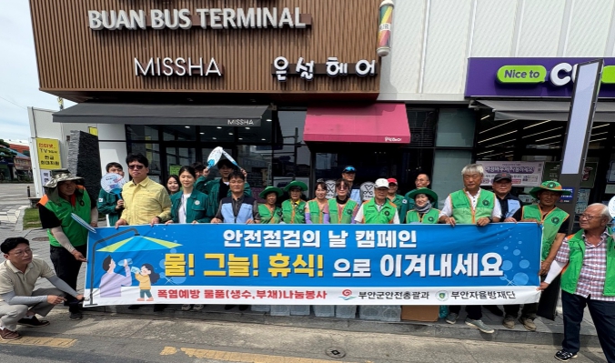 이번 캠페인은 연일 이어지는 폭염과 극한호우 등 각종 안전사고에 대비하고자 마련했으며, 부안군자율방재단, 안전보안관, 안전모니터봉사단 등 안전단체 70여명이 참여해 안전의 중요성을 홍보했다.