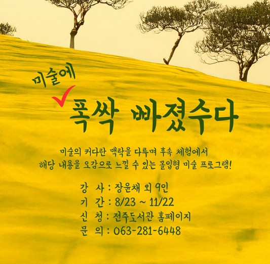 [뉴스노크=김인호 기자] 전주시 금암도서관은 오는 8월 23일부터 11월 22일까지 매주 토요일, 총 11회에 걸쳐 ‘미술에 폭싹 빠졌수다’ 프로그램을 운영한다.
