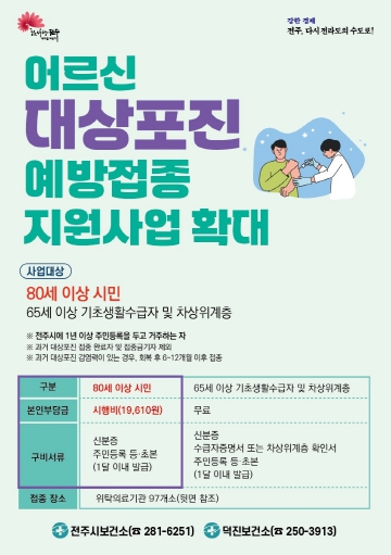 [뉴스노크=김인호 기자] 기초생활수급자와 차상위계층만 가능했던 전주시 ‘어르신 대상포진 예방접종’ 대상이 80세 이상 시민까지 확대됐다.