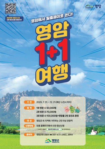 [뉴스노크=김인호 기자] 영암군이 이달 말일부터 올해 말까지 2인 이상 관광객에게 최대 24만원의 지역화폐 등을 주는 ‘영암여행 원플러스원(1+1)’ 사업을 진행한다.