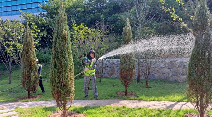 특히 한낮 기온이 급격히 치솟는 낮 시간을 피해 아침과 저녁 시간대를 중심으로 수목 뿌리에 수분이 충분히 흡수될 수 있도록 집중적으로 물을 공급하고 있다.