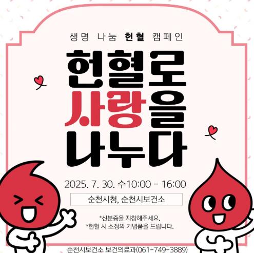 [뉴스노크=김인호 기자] 순천시는 하절기 생명나눔 문화 확산을 위해 오는 30일 오전 10시부터 오후 4시까지 순천시청과 순천시보건소 앞에서 사랑의 헌혈 행사를 진행한다고 밝혔다.