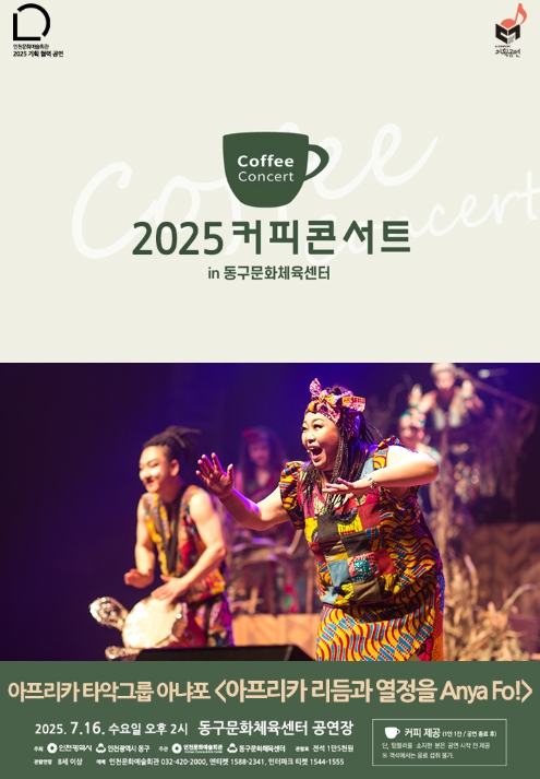 [뉴스노크=김인호 기자] 인천 동구문화체육센터는 오는 16일 오후 2시 커피콘서트의 마지막 무대를 선보인다고 밝혔다. 이번 무대는 아프리카 타악그룹 ‘아냐포(Anya Fo)’가 출연해, 관객과 어우러지는 신명 나는 공연이 펼쳐질 예정이다.