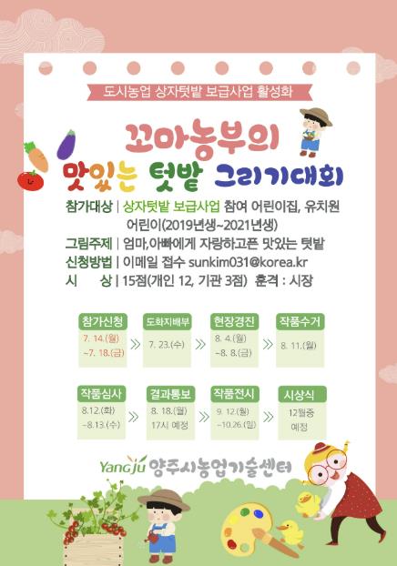 이번 대회는 양주시농업기술센터에서 추진한 '상자텃밭 보급사업'에 참여한 기관(어린이집, 유치원)을 대상으로 진행되며, 자투리공간을 활용한 작물재배 활동으로 도시농업의 이로움을 널리 알리고자 추진하는 어린이 눈높이 맞춤형 그리기 대회다.