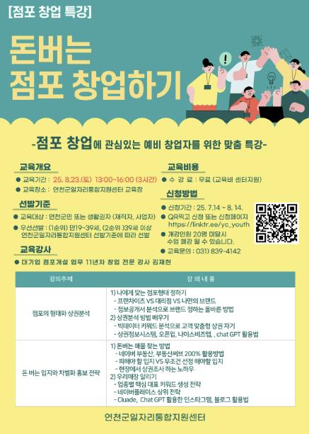 교육은 연천군민 또는 생활자 중 점포 창업 희망자 대상으로 하며, 교육신청은 7월 14일부터 8월 14일까지 QR코드 또는 신청 링크를 통해 가능하다.