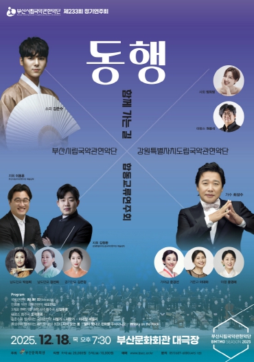 [뉴스노크=김인호 기자] 부산시립국악관현악단(예술감독 이동훈)의 제233회 정기연주회가 다가오는 12월 18 오후 7시 30분, 부산문화회관 대극장에서 강원특별자치도립국악관현악단 합동교류연주회가 '함께 가는 길, 동행'이라는 부제로 개최된다.