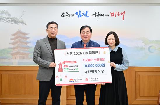 [뉴스노크=김인호 기자] 김천시는 지난 1일, 태찬장례식장이 이웃돕기 성금 1,000만 원을 전달하며 희망2026나눔캠페인‘김천 1호’ 기부자가 됐다고 밝혔다.