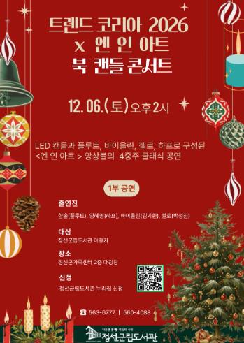 [뉴스노크=김인호 기자] 정선군립도서관은 오는 12월 6일 오후 2시, 정선군 가족센터 2층 대강당에서 ‘트렌드 코리아 2026 × 엔 인 아트 북 캔들 콘서트’를 개최한다고 2일 밝혔다.