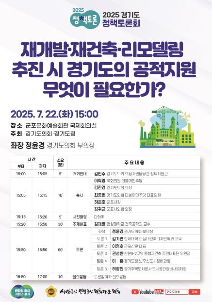 경기도 정책토론회는 경기도의회와 경기도청이 공동으로 주최하며, 누구나 사전 신청 없이 현장 또는 유튜브를 통해 참여할 수 있다.