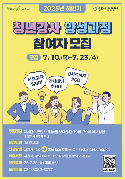 [뉴스노크=김인호 기자] 양주시는 청년의 재능을 전문 강의 역량으로 발전시키는 䶩하반기 청년강사 양성과정”을 모집 및 운영한다고 밝혔다.