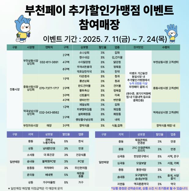 ‘부천페이 추가할인 가맹점’은 부천페이로 결제 시 기본 인센티브 외에 결제 금액의 3% 또는 5%를 추가 할인해 주는 매장을 말한다. 현재 상동시장, 중동사랑시장, 역곡상상시장 등 전통시장을 중심으로 운영 중이며, 일반 매장은 28곳이 등록돼 있다.