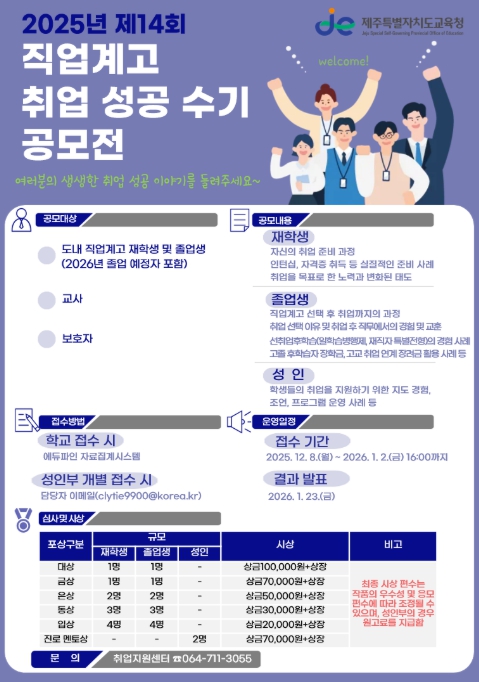 [뉴스노크=김인호 기자] 제주특별자치도교육청은 고졸 취업 성공 문화를 확산하고 직업계고에 대한 긍정적 인식을 높이기 위해‘제14회 직업계고 취업 성공 수기 공모전’을 8일부터 내년 1월 2일까지 개최한다.