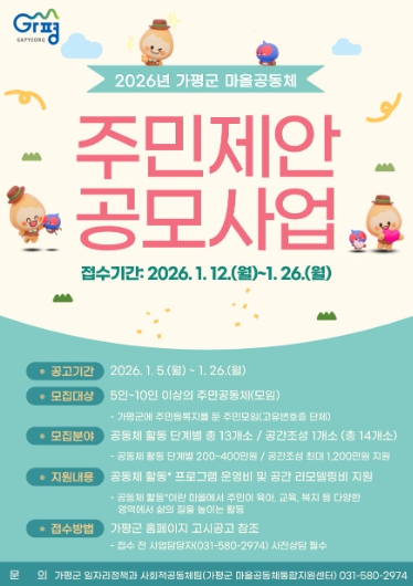[뉴스노크=김인호 기자] 가평군이 주민 주도의 마을공동체 활성화를 위해 ‘2026년 가평군 마을공동체 주민제안 공모사업’을 추진한다.