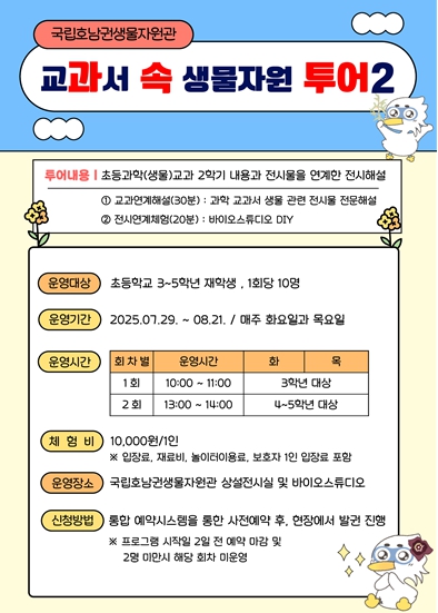 ‘과속투어2’ 프로그램은 7월 29일부터 8월 21일까지 매주 화요일과 목요일에 반복 운영되며 3학년 대상은 오전 10시, 4∼5학년 대상은 오후 1시에 운영될 예정이다. 매 회차별로 사전 예약이 필요하며 국립호남권생물자원관 누리집 상단의 통합예약시스템*을 통해 원하는 날짜를 선택해 신청할 수 있다.