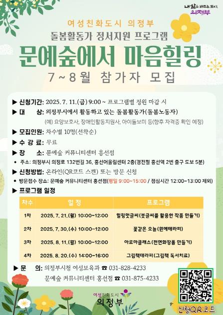 [뉴스노크=김인호 기자] 의정부시는 7월 11일부터 돌봄활동가 정서지원 프로그램 ‘문예숲에서 마음힐링’ 7~8월 참여자를 모집한다.