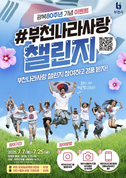 참여 방법은 ‘부천시 공식 인스타그램’ 팔로우 후, 약 20초 분량의 챌린지 구간을 촬영해 개인 인스타그램 계정에 ‘#부천나라사랑챌린지’, ‘#광복80주년’ 해시태그와 함께 업로드하면 된다.