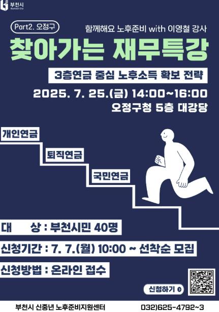 이번 강의는 부천시민 40명을 대상으로 진행되며, 7월 7일 오전 10시부터 구글폼을 통해 선착순 신청을 받는다. 자세한 내용과 신청은 부천시 신중년 노후준비지원센터 홈페이지 또는 전화로 확인할 수 있다.