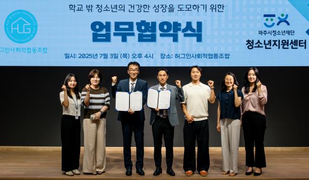 [뉴스노크=김인호 기자] (재)파주시청소년재단 청소년지원센터는 2025년 7월 3일, 허그인사회적협동조합과 학교 밖 청소년들의 자립과 진로 탐색을 위한 업무협약을 체결했다.