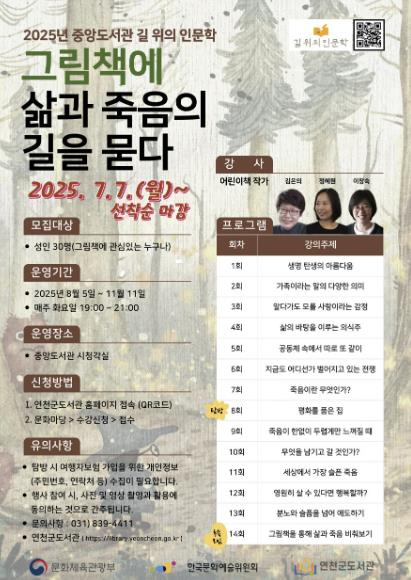 이번 중앙도서관 '길 위의 인문학' 프로그램은 '그림책에 삶과 죽음의 길을 묻다'라는 주제로 진행된다. 특히 어린이책 작가 3인이 강연에 참여하여 그림책을 통해 삶을 이해하고 죽음을 성찰하는 성인을 위한 참여형 교육 프로그램을 선보인다.