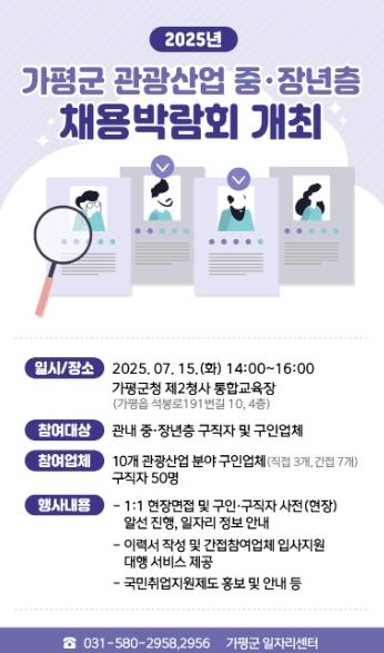 [뉴스노크=김인호 기자] 가평군은 오는 15일 제2청사 4층 통합교육장에서 ‘2025년 중장년층 관광산업 채용박람회’를 개최한다고 밝혔다.